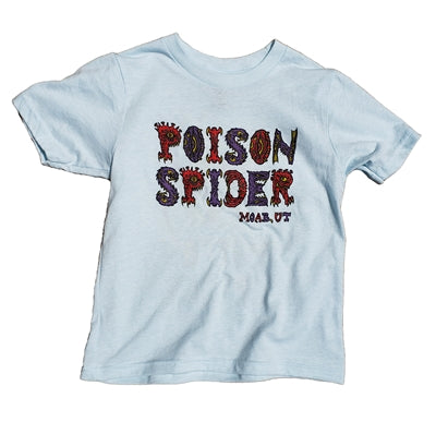 Our Wasp Spider T-shirt, now also for the little shredders! Pale blue, super soft fabric.